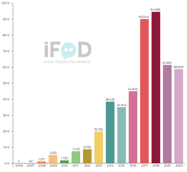 Reference: İFÖD, Fahrenheit 5651: The Scorching Effect of Censorship, October 2021, ISBN: 978-605-69446-5-9, https://ifade.org.tr/reports/EngelliWeb_2020_Eng.pdf