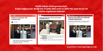 Finally, news articles about an Egyptian businessman, Imad Kachkoul, who wanted to return to his country with a private plane due to the COVID-19 pandemic, claimed that he was defrauded by a former AKP Adıyaman Deputy and his relatives were blocked by a decision of the Internet Access Providers Association (“ESB”) on 11.09.2020 (no. 2020/153) on the grounds of personal rights violation.