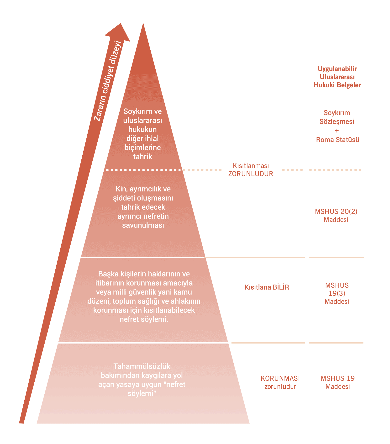 Yukarıdaki nedenlerle, ARTICLE 19 ‘nefret söylemine’ yönelik etkili ve tüm boyutları dikkate alan incelikli bir müdahalenin kritik öneme sahip olduğunu düşünmektedir. “Nefret söylemini” ifadenin ağırlığı ve etkisine göre -uluslararası insan hakları hukukunda belirtildiği şekilde- belirlemek için bir tipoloji öneriyoruz. Bu tipolojiyi, ifade özgürlüğü ve eşitlik hakkının karşılıklı olarak pekiştirici niteliğini dikkate alan uygun yanıtlara rehberlik etmesi için öneriyoruz.