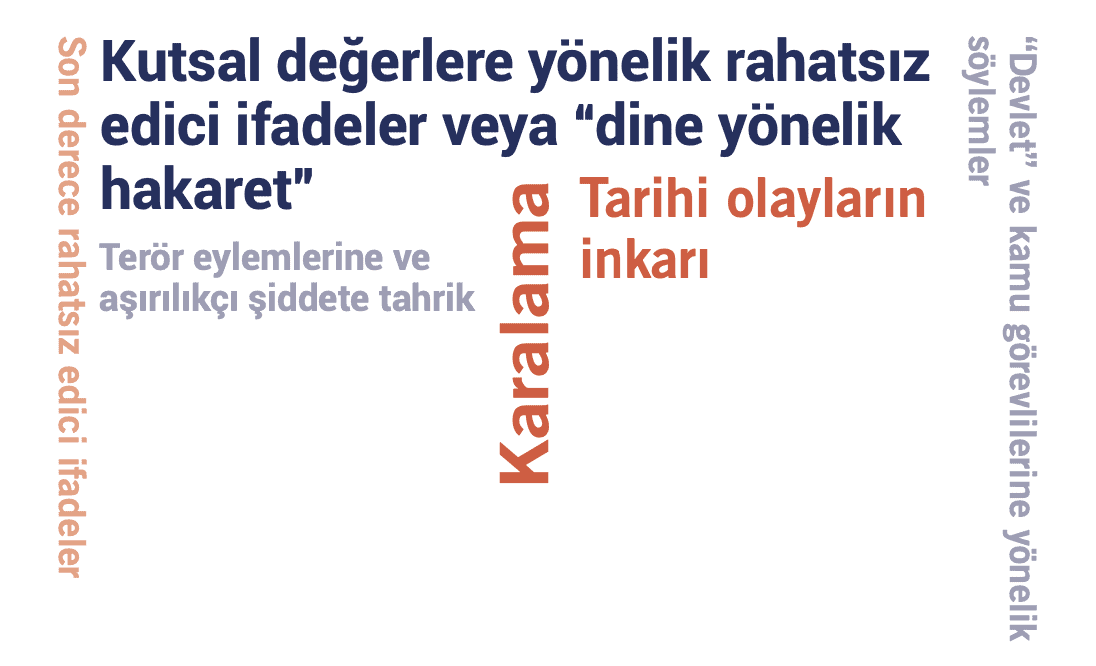 - Kutsal değerlere yönelik rahatsız edici ifadeler veya “dine yönelik karalama”: Uluslararası insan hakları hukuku din veya inanç sistemleri gibi soyut kavramları değil insanları korumaktadır. Fikirler ve kişilerin inançları arasında bir ayrım gözetmekte; kavram olarak din veya inançların kendisini karşıt yorum veya eleştiriden korumamaktadır.